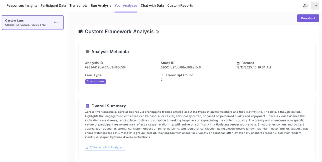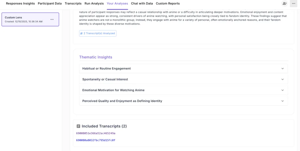 Custom Lens Analysis is a powerful feature that allows you to define your own analytical framework tailored to your specific research objectives and data nuances. Instead of relying on pre-built analysis lenses, you can provide detailed instructions on exactly how you want your data analyzed, what themes to look for, and how to organize the results – giving you complete control over your qualitative research methodology.