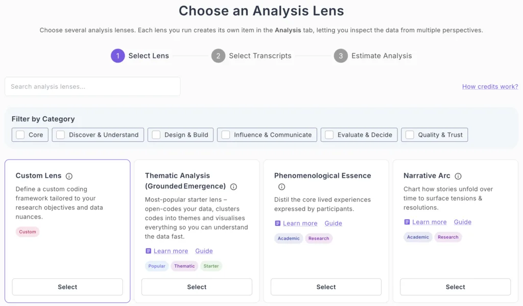 Transform your interview data with frameworks designed specifically for your research needs. Custom Lens gives you the flexibility of tailored analysis with the speed and scale of AI automation.
