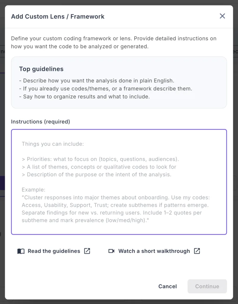Example: "Cluster responses into major themes about onboarding. Use my codes: Access, Usability, Support, Trust. Separate findings for new vs. returning users. Include 1–2 quotes per subtheme." 4. Review Your Instructions: You can click "Read the guidelines" or "Watch a short walkthrough" for additional help. 5. Click "Continue" once you've defined your framework.