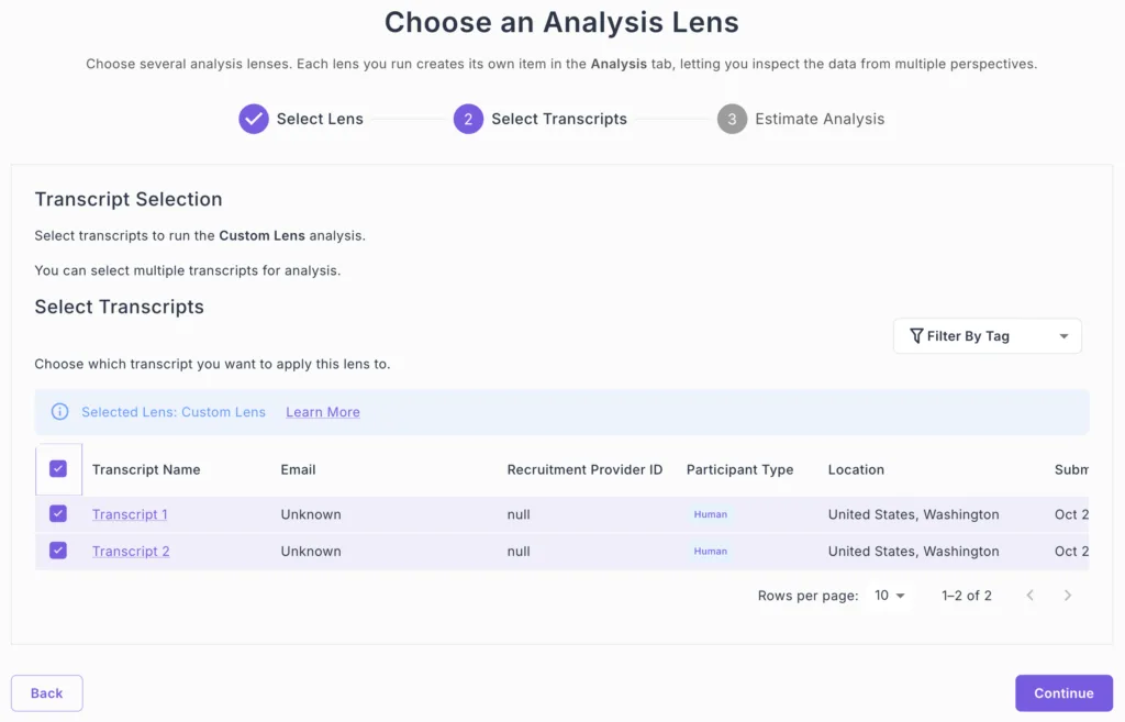 Now you'll choose which transcripts to analyze with your custom framework: