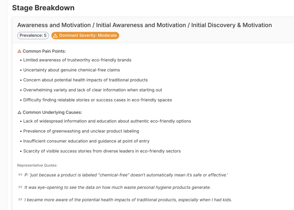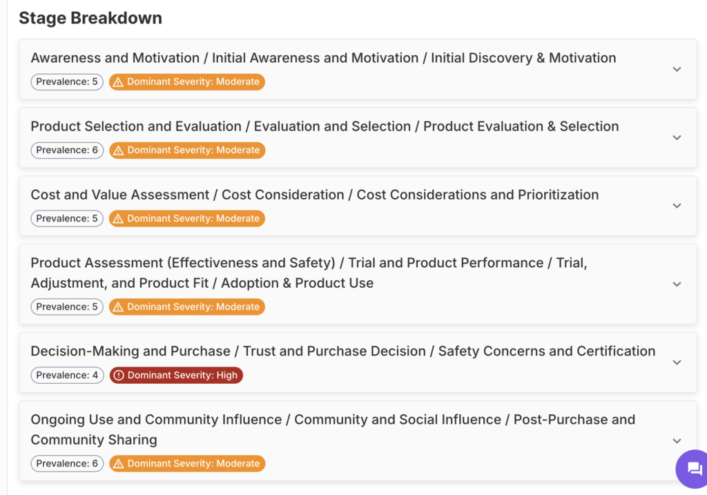 Here you can review the stage breakdowns based on your interview. It maps the emotional weight of each decision stage, uncovering moments of confusion, cost-driven hesitation, trust breakdowns, and social pressure that influence the journey end-to-end.