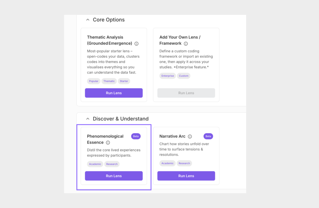 The Phenomenological Essence Lens helps you see the world through your participants’ eyes. Whether it's the joy of finding a product that aligns with participants' values or the tension of navigating trade-offs, this lens reveals the essence of human experience. This lens synthesis of emotional drivers, tensions, and meaning from across your interviews in one clear narrative.