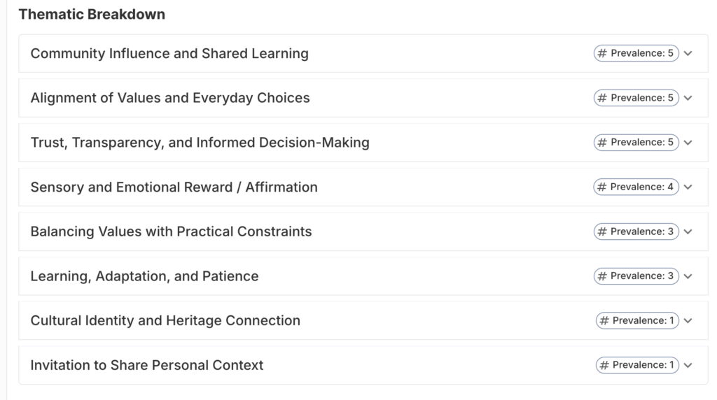 Here you can overview multiple thematic breakdowns based on your interview. Each theme tells its own story. You’ll see how often it appears and what emotional layers are attached—like trust, community,etc.