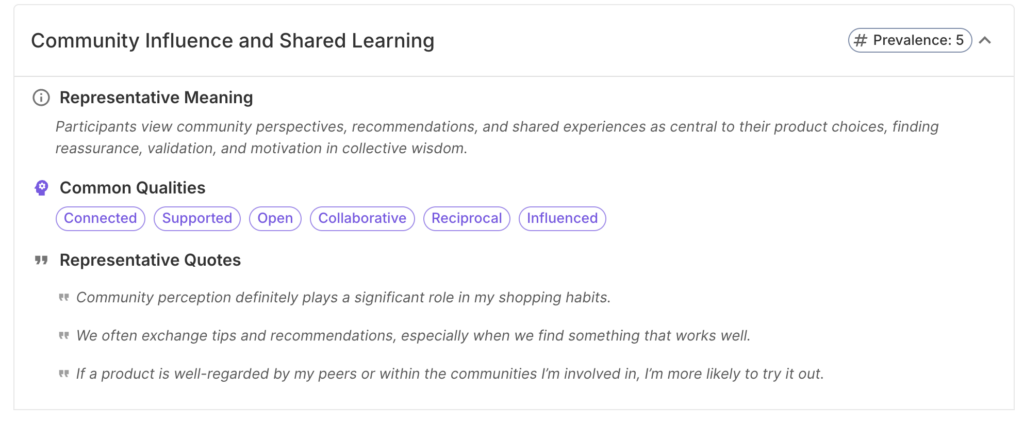 You can zoom into individual themes and hear your participants’ voices firsthand with representative meanings, qualities, and quotes.