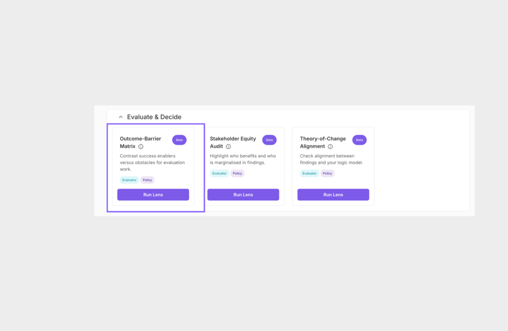 Here, we have selected the Outcome-Barrier Matrix Lens.