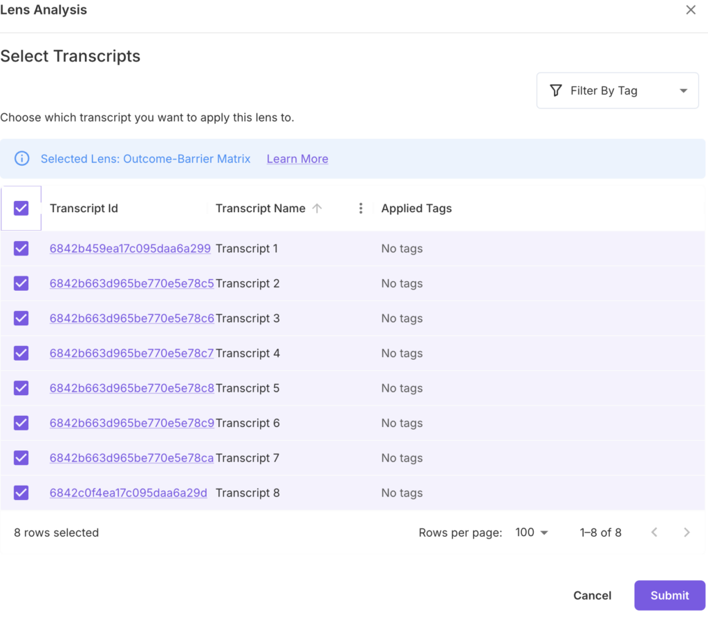 To get started with Outcome-Barrier Matrix Lens analysis, you’ll need transcripts of interviews uploaded into your Qualz.ai workspace. You can do this in two ways: