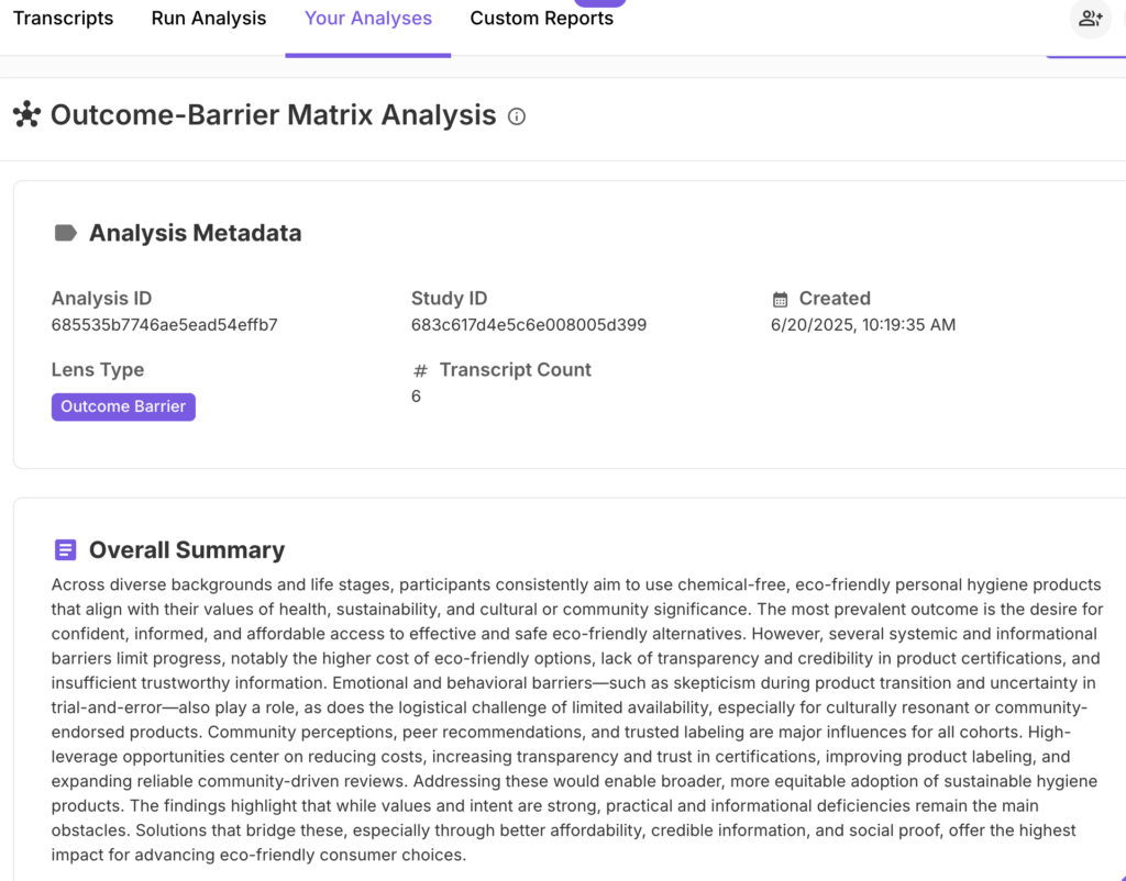 Go to the “Your Analyses” tab to view your completed analysis. With Qualz.ai’s Outcome-Barrier Matrix Lens, you can move from scattered transcript excerpts to a system-level map of challenges and breakthrough paths; capturing exactly what users are trying to achieve and what’s standing in their way.