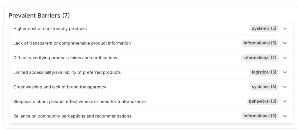 With the Outcome-Barrier Matrix Lens, you get an automated list of the top barriers, supported by representative quotes and coded type, such as: