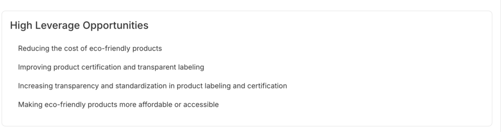 “Difficulty verifying product claims and certifications” (Informational). “Higher cost of eco-friendly products” (Systemic)