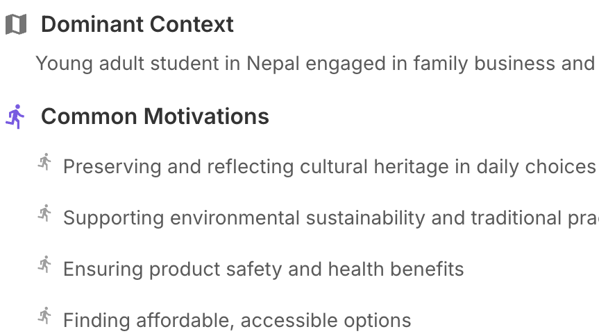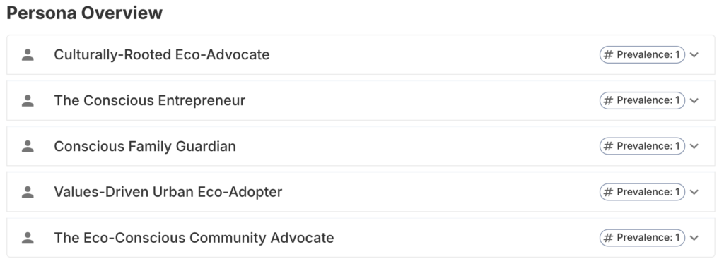 This lens automatically provides profiles like The Culturally-Rooted Eco-Advocate and help contextualize users’ needs, influences, and behaviors across environments, each persona tied to real motivations and quotes.