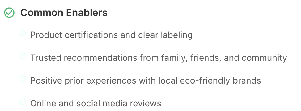 Friction and Enabler Mapping Automatically surfaces blockers (e.g., unclear labeling, skepticism, price) and enablers (e.g., social recommendations, transparent branding) for each persona-task pair, making it easy to prioritize interventions.