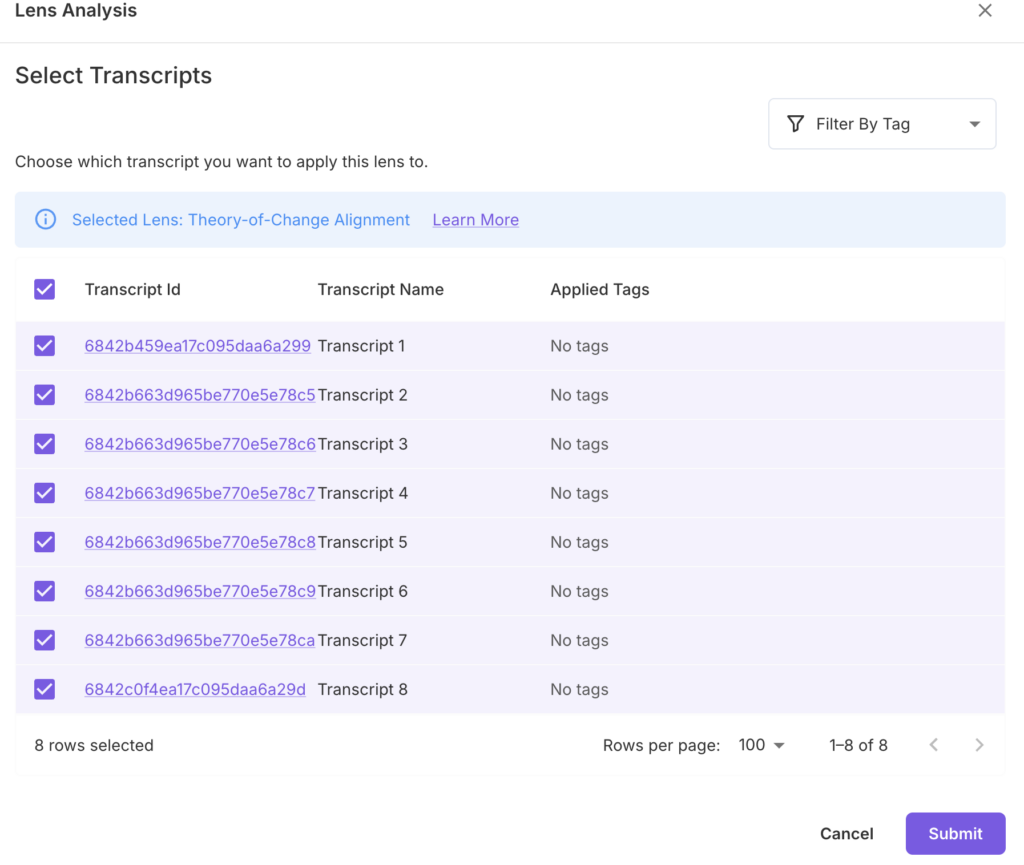 - Check the box next to each transcript you wish to analyze.