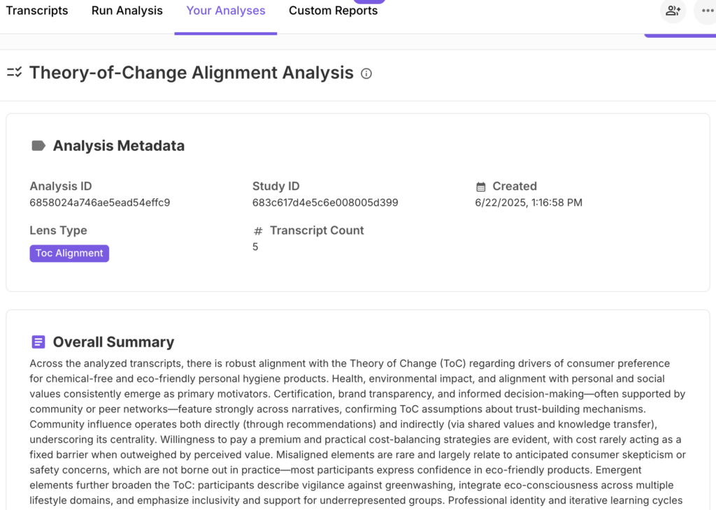 Go to the “Your Analyses” tab to view your completed analysis. With Qualz.ai’s Theory-of-Change Alignment Lens, you can assess how closely real participant narratives align with your strategic logic model, revealing aligned, emergent, and misaligned drivers across transcripts to refine program assumptions with evidence-backed clarity.