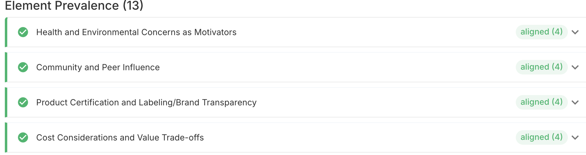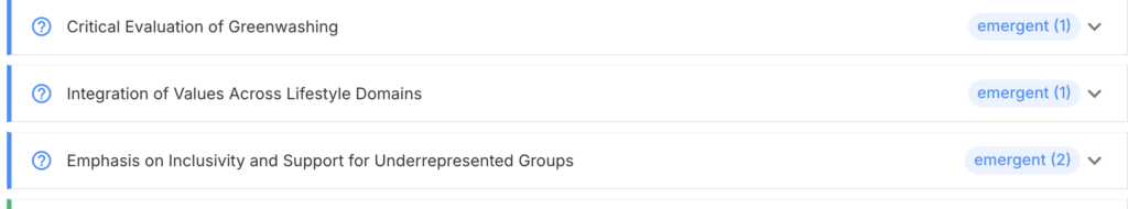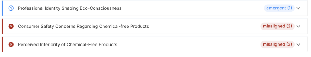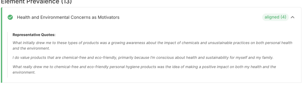 With this lens, you can get direct representative quotes for a selected Theory of Change (ToC) element (e.g., Health and Environmental Concerns as Motivators). This analysis adds qualitative depth to alignment ratings and brings participant voices into your ToC narrative.
