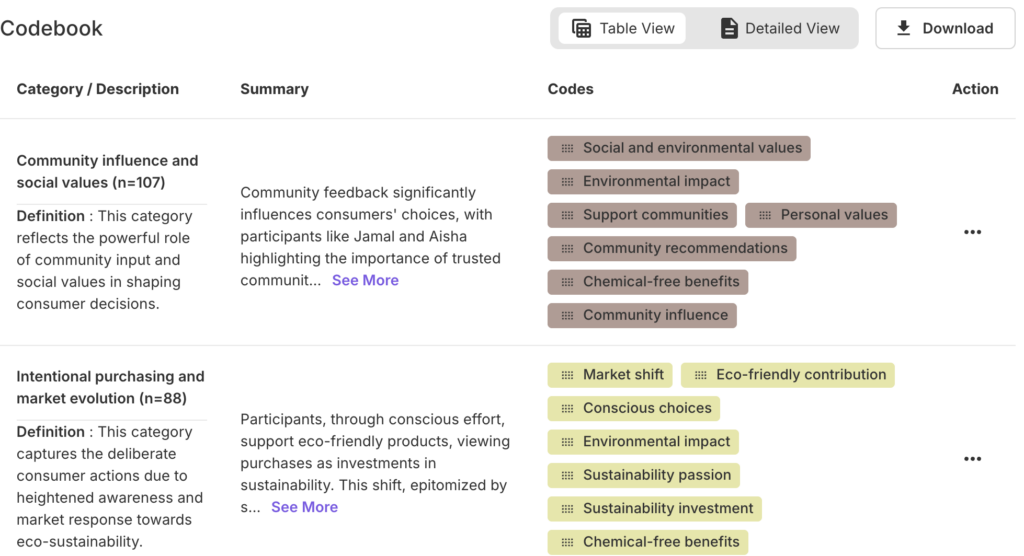 Surface Meaningful Code Categories Automatically generate and group granular insights into well-defined thematic categories like Community Influence and Social Values or Trust and Assurance, helping you move from scattered feedback to structured meaning.