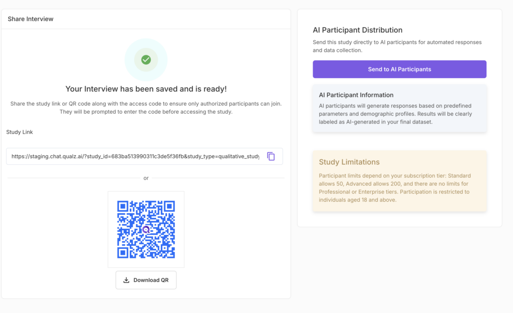 QR Code • Participants can scan the QR code to access the interview. • Click Download QR to save and print or share it digitally.