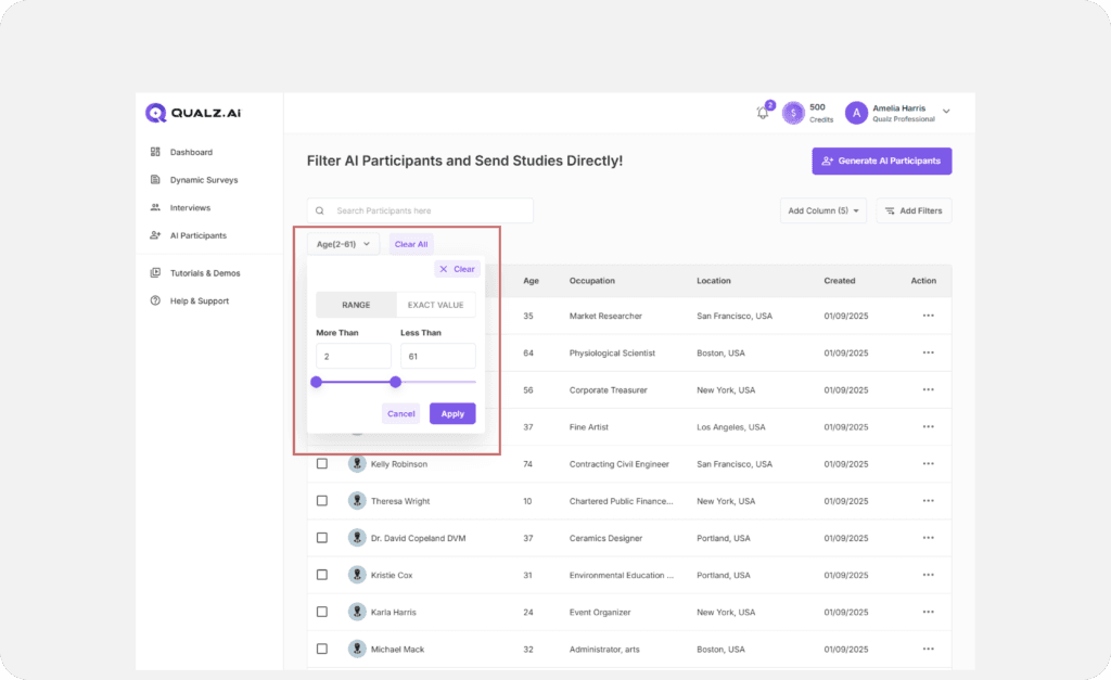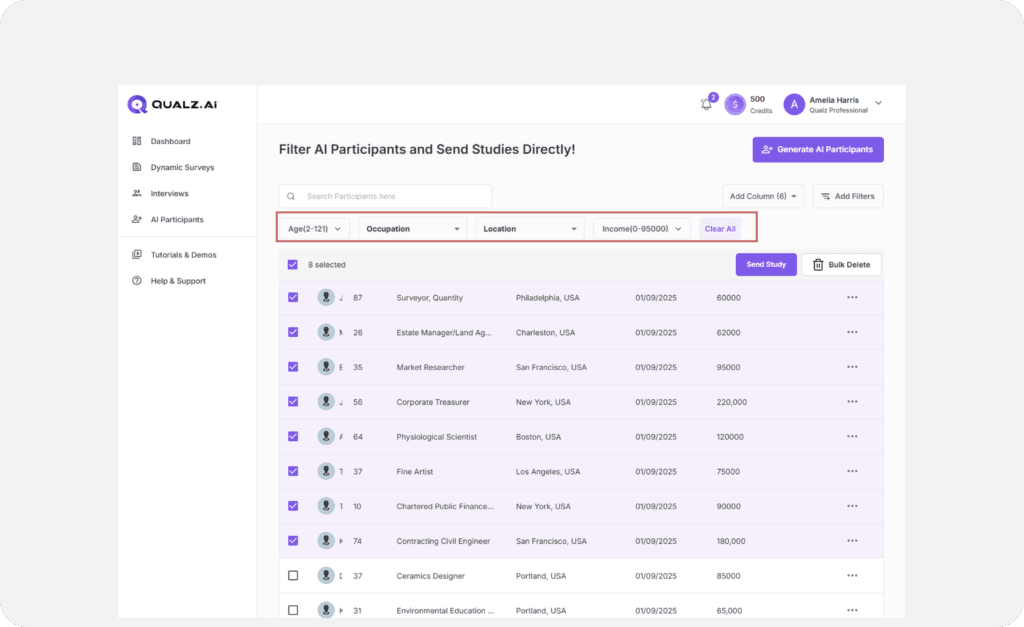 Efficiently refine and filter AI participants to ensure they align with your survey goals. By applying filters and customizing attributes, you can target specific demographics or characteristics before sending out your survey. Follow these steps to streamline the process and maximize the relevance of your data.