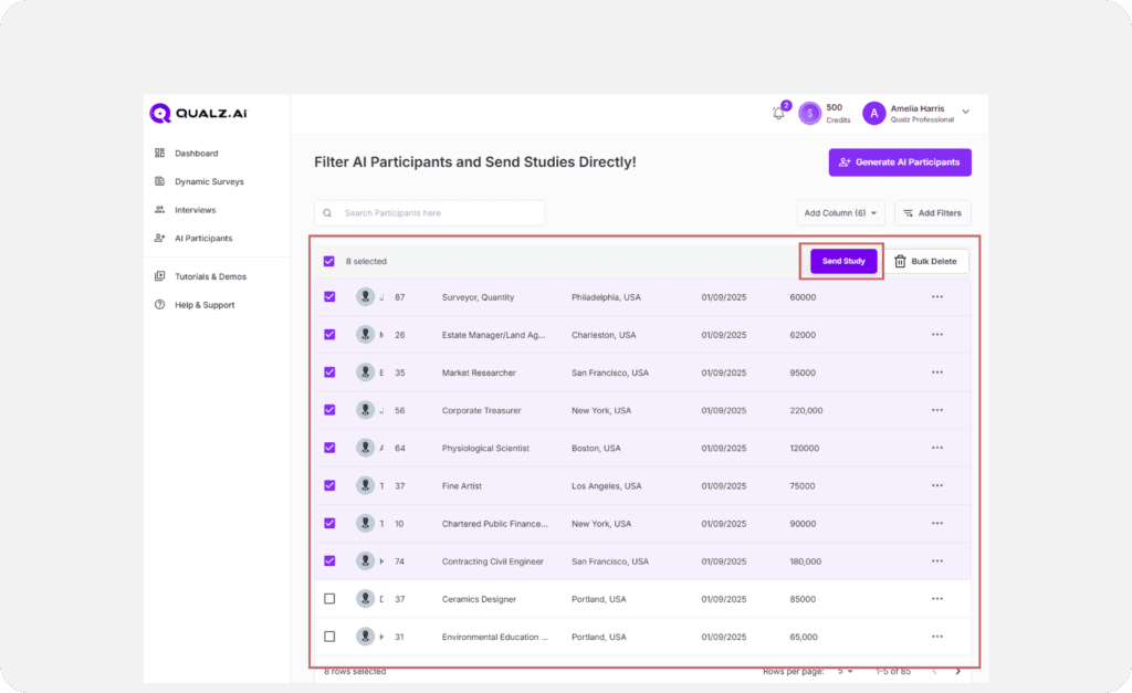 Once participants are filtered and selected, click Send Study to distribute your survey