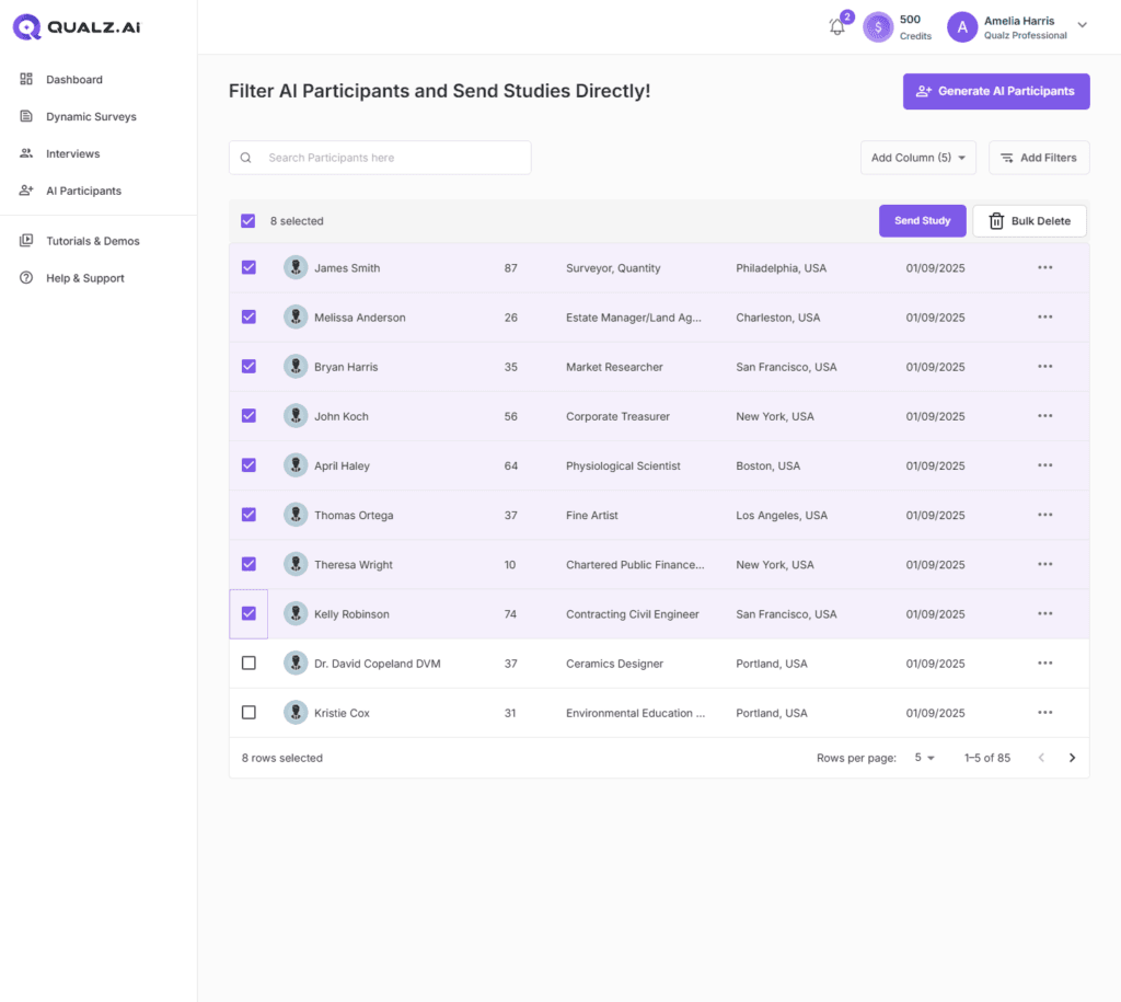 - If you’d like to customize your participant pool, click Generate AI Participants to create a new list.