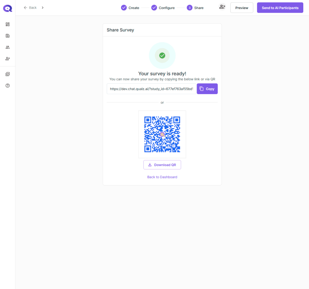 After creating and finalizing your study on the Qualz.ai platform, you can share it with AI participants available in the system. To do this, click on the Send to AI Participants option.