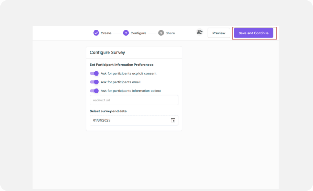 After finalizing participant information preferences and previewing your survey, proceed to Save and Continue to share your survey.