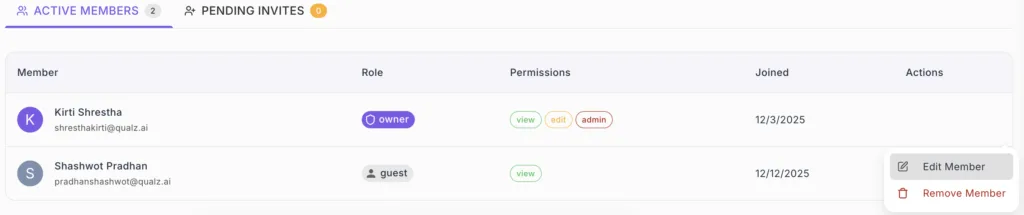 Note: Only workspace Owners and Admins can access member management settings. Members and Guests cannot manage other members.