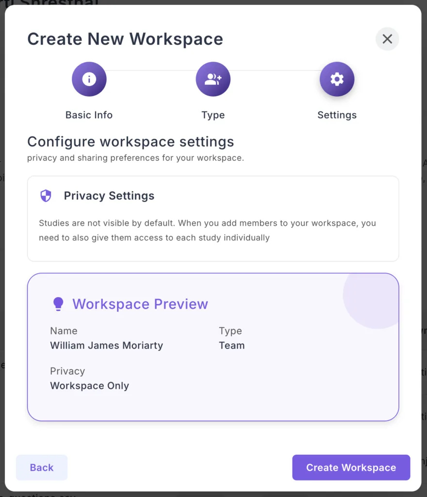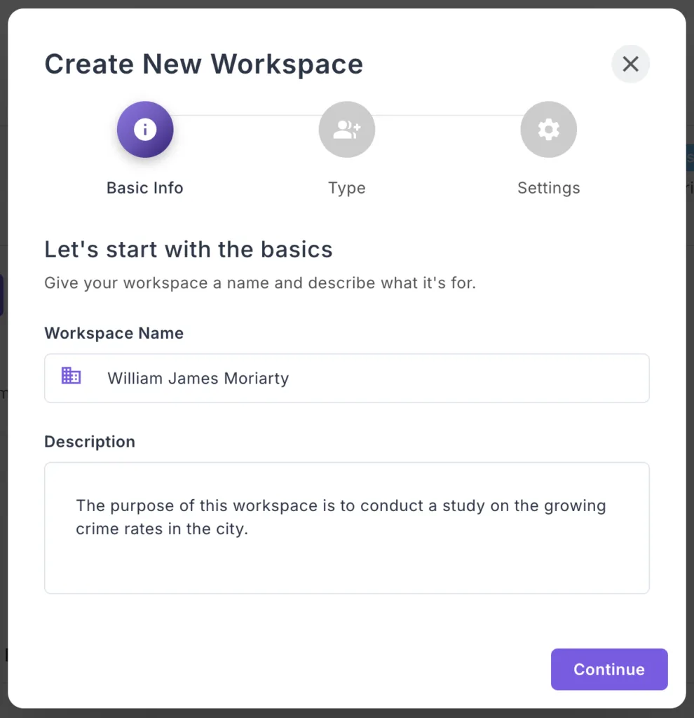 Creating a new workspace takes just 3 simple steps. This is available for Professional and Enterprise tier users.