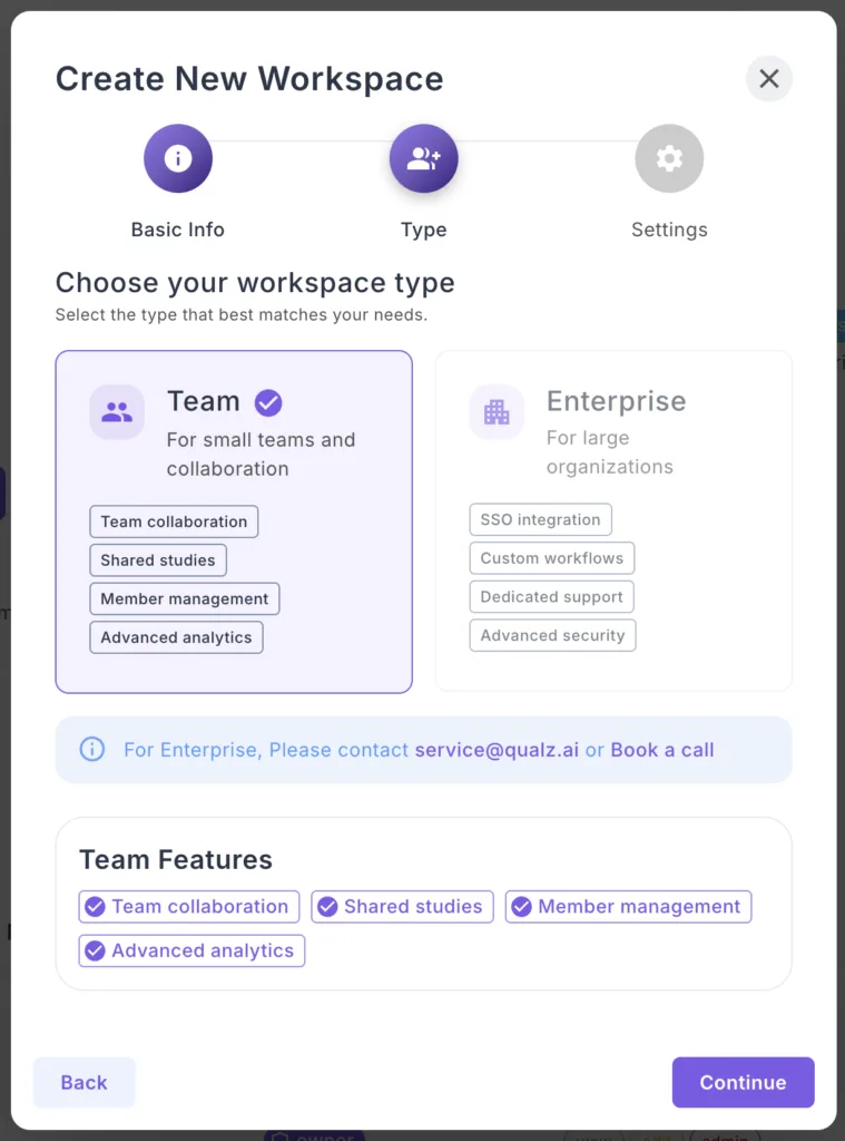 - Contact sales@qualz.ai to discuss Enterprise needs