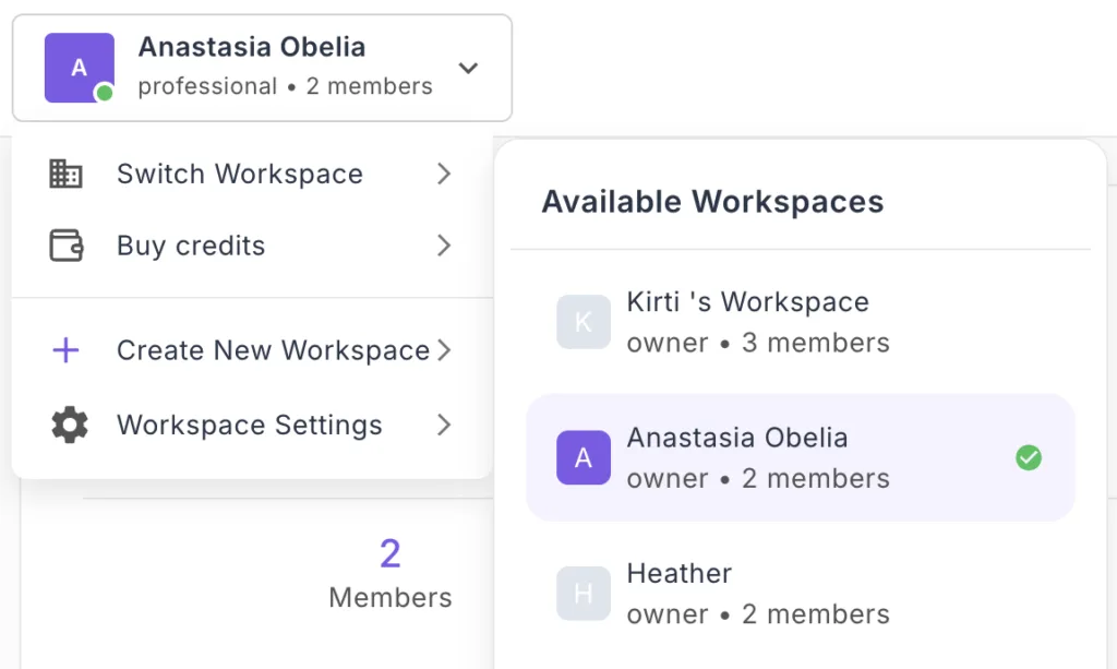 - You'll see your workspace initial, name, tier, and member count