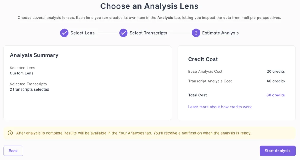 - Total Cost: Base Analysis Cost + Transcript Analysis Cost. Will be displayed based on your selection
