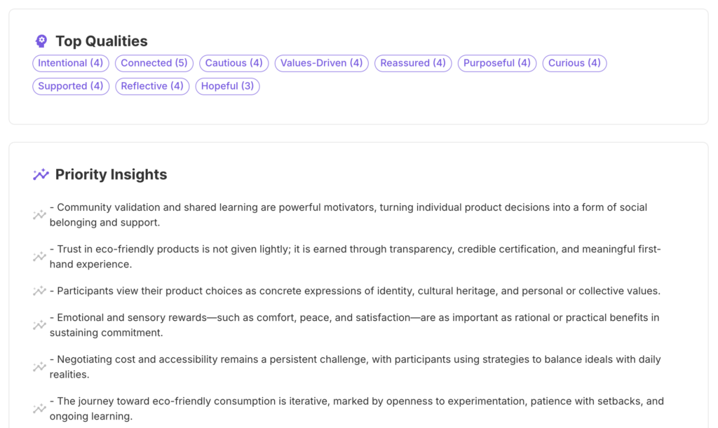 The Phenomenological Essence Lens helps you see the world through your participants’ eyes. Whether it's the joy of finding a product that aligns with participants' values or the tension of navigating trade-offs, this lens reveals the essence of human experience. This lens synthesis of emotional drivers, tensions, and meaning from across your interviews in one clear narrative.