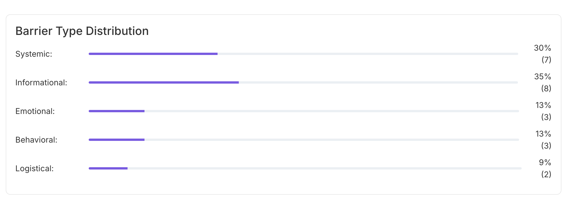 This lens provides barrier-type distribution segmented by systemic, informational, emotional, behavioral, and logistical types.