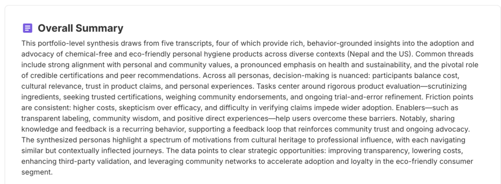 This lens automatically provides profiles like The Culturally-Rooted Eco-Advocate and help contextualize users’ needs, influences, and behaviors across environments, each persona tied to real motivations and quotes.