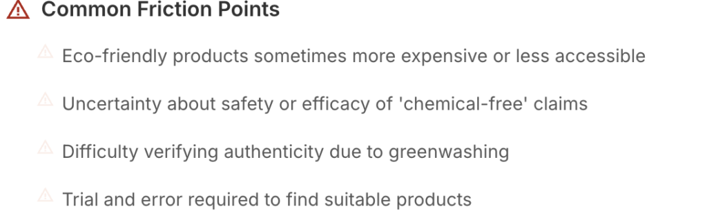 Friction and Enabler Mapping Automatically surfaces blockers (e.g., unclear labeling, skepticism, price) and enablers (e.g., social recommendations, transparent branding) for each persona-task pair, making it easy to prioritize interventions.