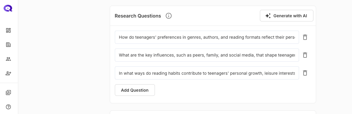 - To create research questions effortlessly, click on the “Generate with AI” button located at the top-right corner of the Research Questions section that comes after the Interview Type section.