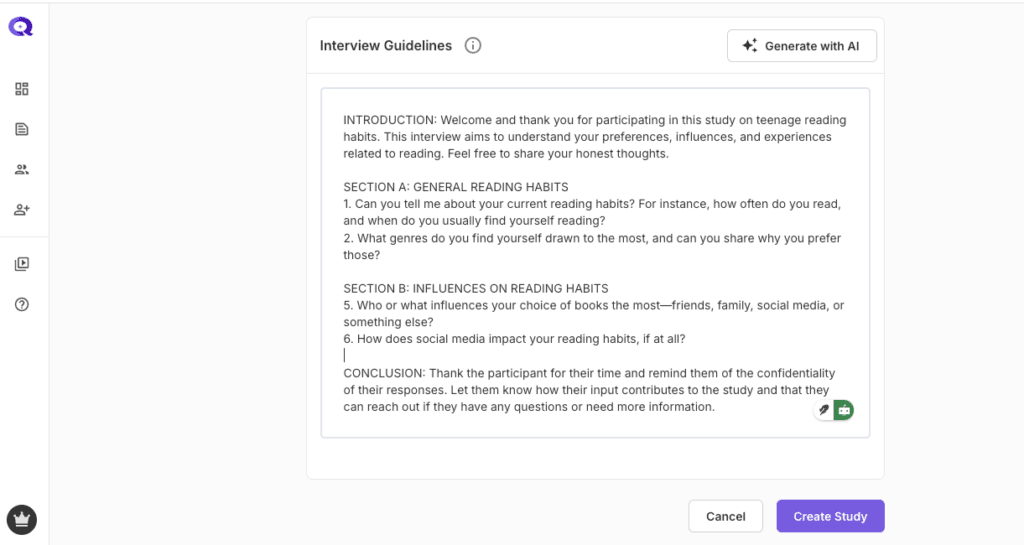 By using the “Generate with AI” feature, you can save time and create research questions and comprehensive guidelines for a seamless interview process.