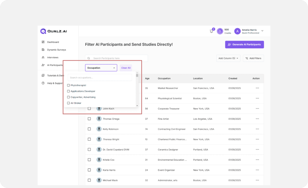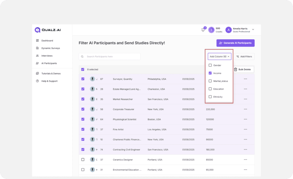 Efficiently refine and filter AI participants to ensure they align with your survey goals. By applying filters and customizing attributes, you can target specific demographics or characteristics before sending out your survey. Follow these steps to streamline the process and maximize the relevance of your data.